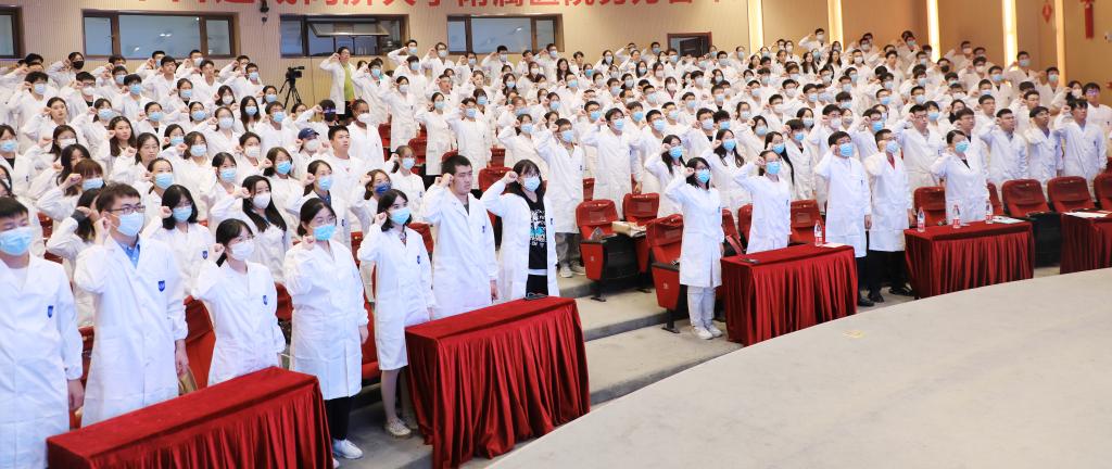 在座全体医学生穿上了被授予的白大褂,在杨文卓的带领下进行宣誓:“我志愿献身医学,热爱祖国,忠于人民,恪守医德,尊师守纪,刻苦钻研,孜孜不倦,精益求精,全面发展。我决心竭尽全力除人类之病痛,助健康之完美,维护医术的圣洁和荣誉。救死扶伤,不辞艰辛,执着追求,为祖国医药卫生事业的发展和人类身心健康奋斗终生!”