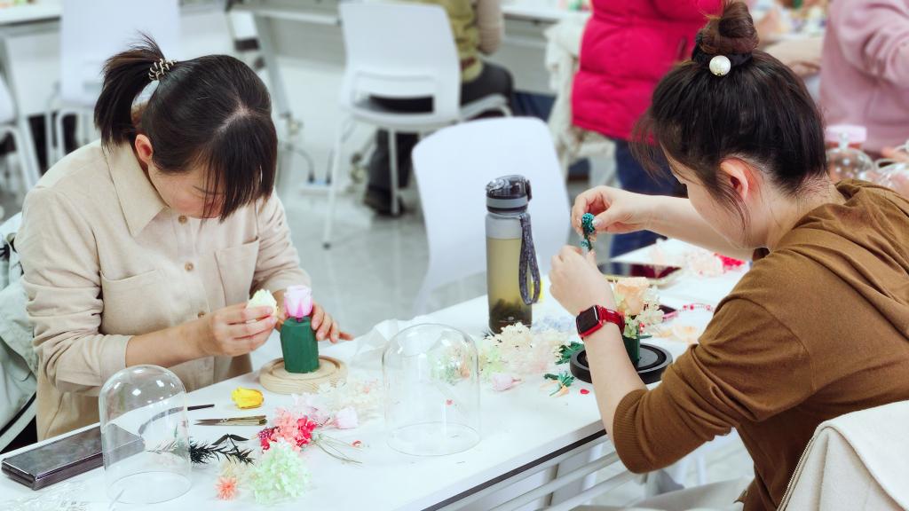 本次活动中,大家了解到珠花制作的基本流程和技巧。随后,老师们现场分步骤示范,气氛活跃热烈,大家充分发挥自己的想象力和创造力,相互交流、互相帮助。一修一剪之间,一个个生机盎然、错落有致、创意十足的永生花作品呈现眼前; 一朵朵栩栩如生的手工花在大家的巧手中“竞相绽放”。