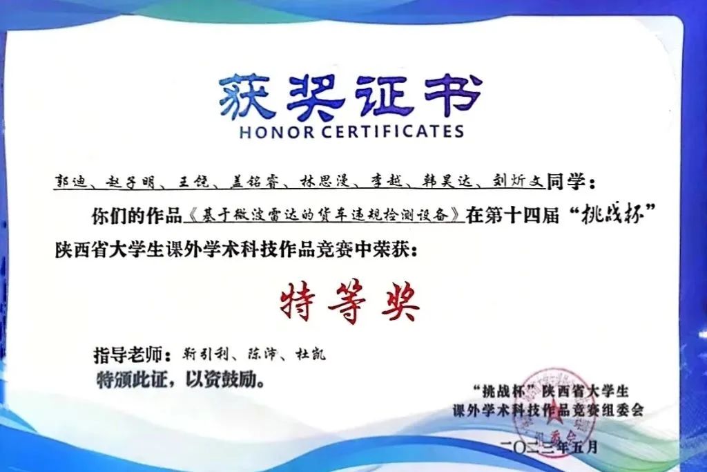 beat365英国官网网站积极响应团省委和校团委号召,广泛组织学生参与本届“挑战杯”竞赛。由学院靳引利教授指导、本科生郭迪、赵子明、王饶、盖铭睿、林思漫、李越、韩昊达、刘炘文同学完成的作品《基于微波雷达的货车违规检测设备》荣获第十四届“挑战杯”陕西省大学生课外学术科技作品竞赛特等奖,实现了学院在此项赛事上的历史性突破,团队成员赵子明同学代表学校在颁奖仪式现场进行路演展示。