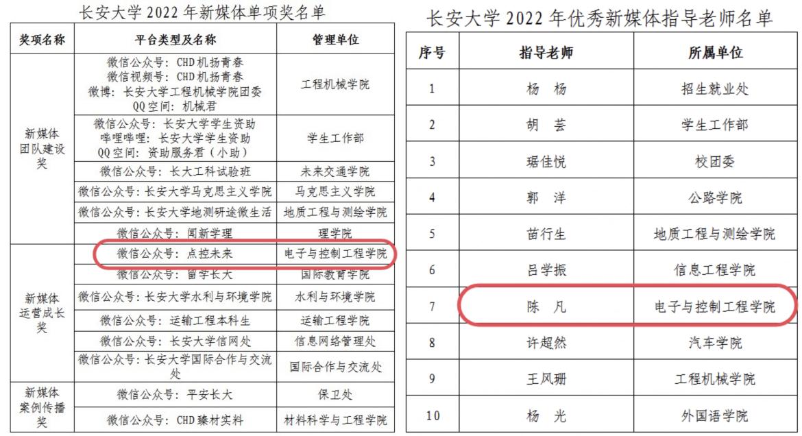 近日,学校党委发布《关于表彰beat365英国官网网站2022年优秀校园新媒体平台及优秀新媒体指导老师的决定》(长大党宣〔2023〕9号),beat365英国官网网站“点控未来”微信公众号荣获“新媒体运营成长奖”,辅导员陈凡荣获“优秀新媒体指导老师”