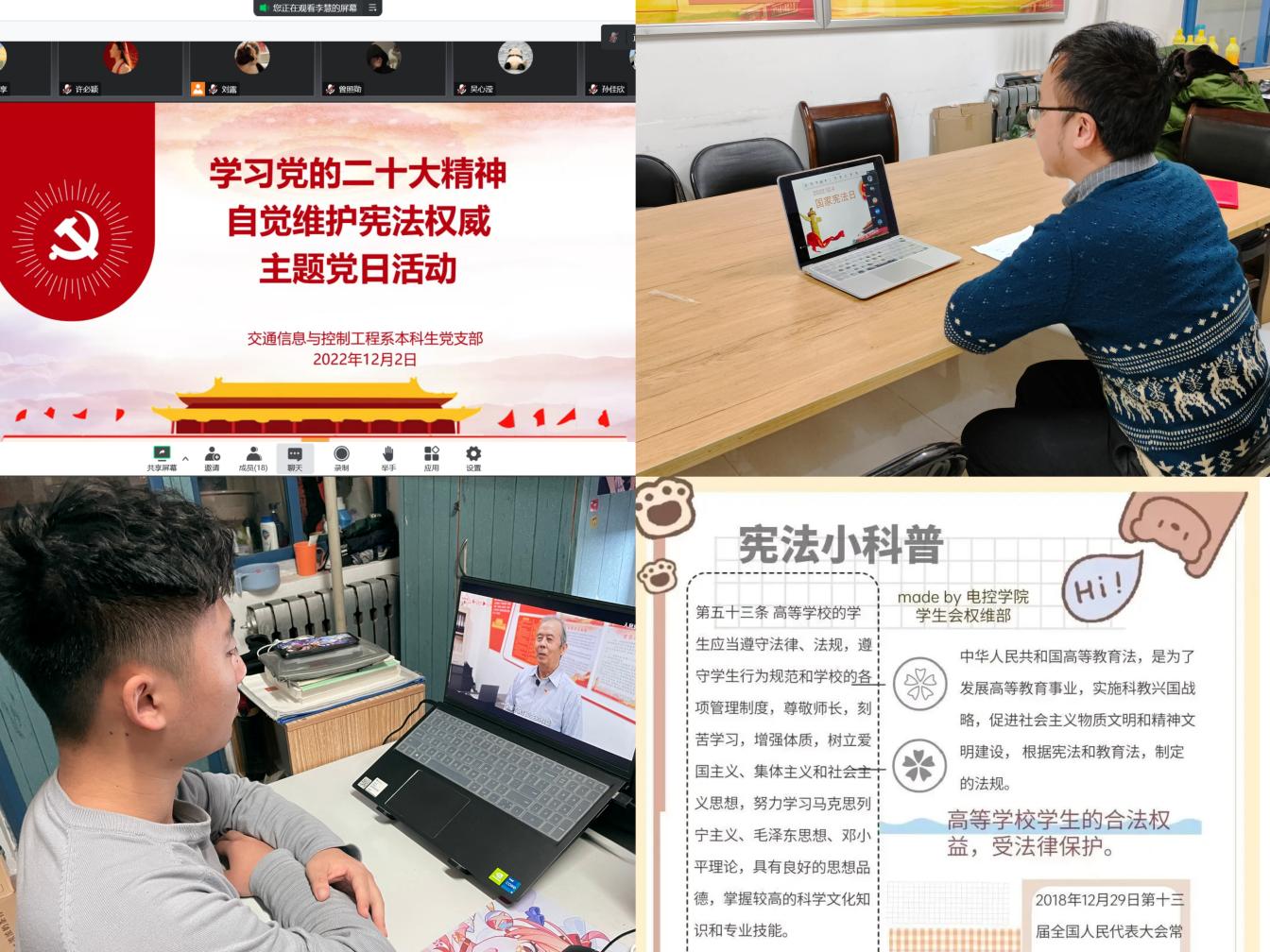 beat365英国官网网站以第九个国家宪法日、现行宪法实施四十周年纪念日为契机,深入学习党的二十大精神和习近平法治思想,宣传宪法知识,弘扬宪法精神。beat365英国官网网站在2022年“宪法宣传周”期间组织开展了“三进”活动,即宪法进网络、宪法进支部、宪法进班级,扎实开展宪法相关的主题党日活动、主题班会和网上答题活动,组织学生制作宪法知识学习手账,学生参与率达到100%,活动开展情况被教育部有关网站报道。