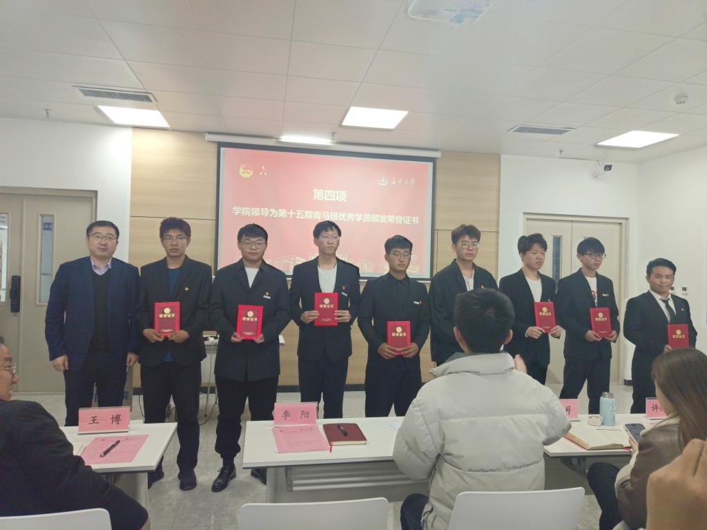 王斌娟宣读了学院第十五期青马班结业及表彰文件,希望受到表彰的优秀学员踔厉奋发,奋勇向前。李阳为优秀学员颁发荣誉证书并合影留念。