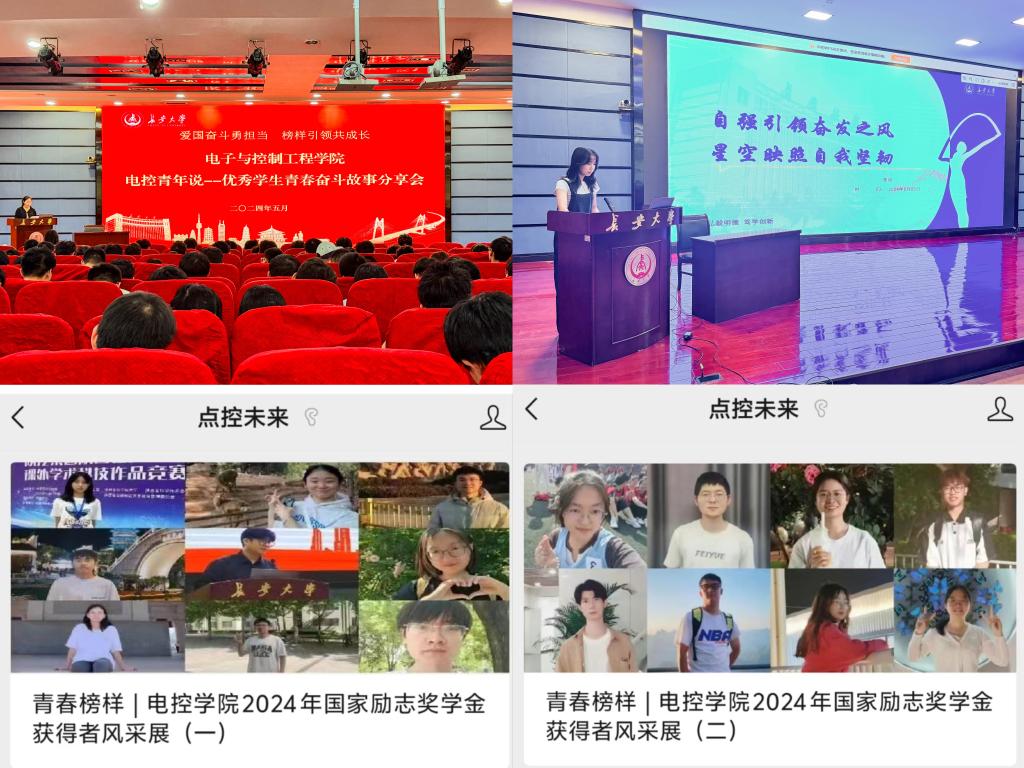 榜样引领,传递青春能量。开展“电控青年说-优秀学生青春奋斗故事分享会”,邀请国家励志奖学金获得者,分享自身受助、诚信、感恩、励志的心路历程;通过学院微信公众平台“点控未来”讲好青春榜样故事,推出国家奖学金、国家励志奖学金获得者、优秀毕业生风采展,充分发挥朋辈示范引领作用,引导学生对标榜样,以诚为本,奋发图强。