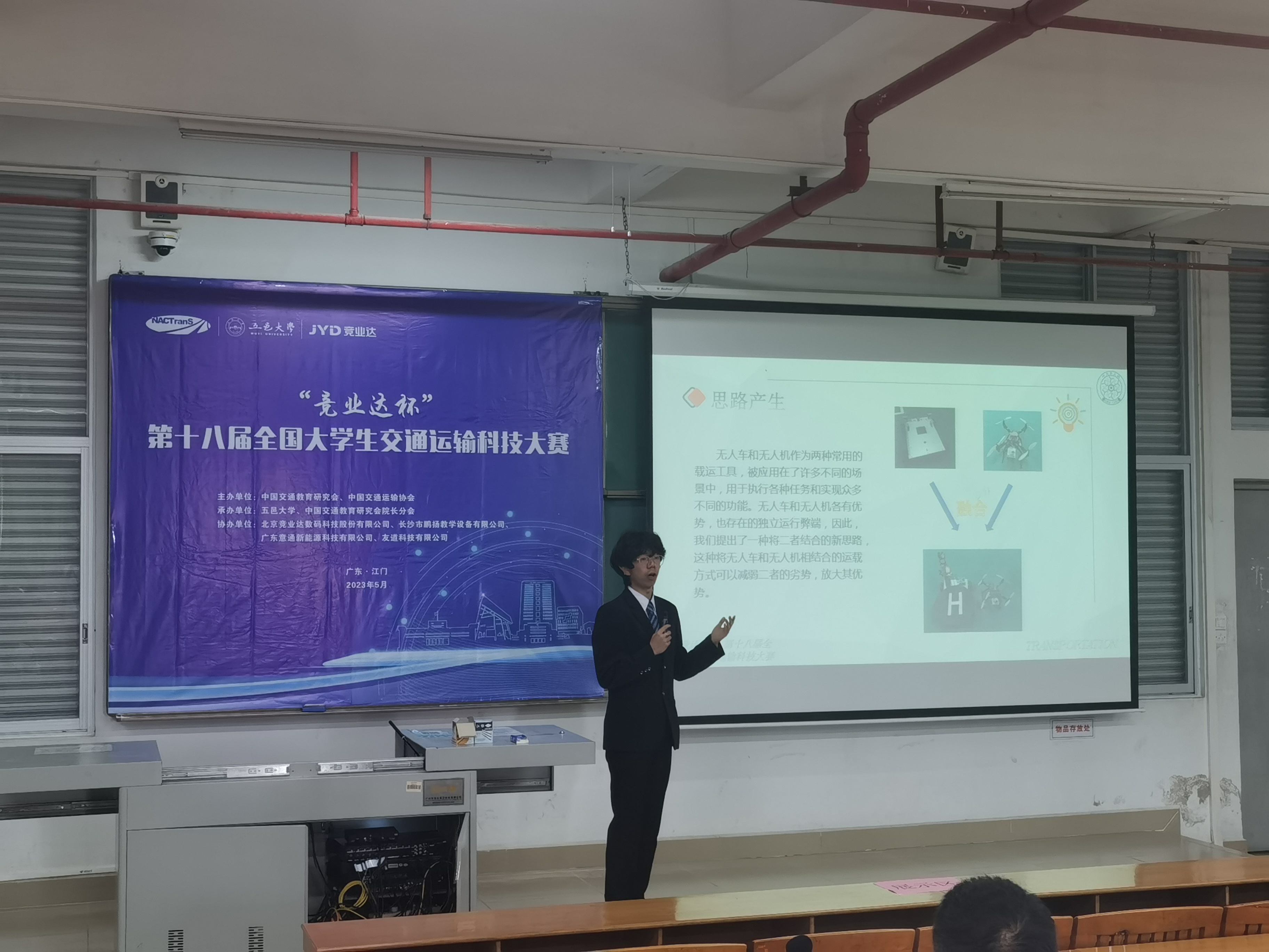 5月28日,第十八届全国大学生交通运输科技大赛总决赛在广东江门落下帷幕。本次大赛共吸引了全国1000余支高校队伍参赛,经过层层选拔共235件作品入围全国总决赛。beat365英国官网网站黄鹤教授指导的研究生谢飞宇、胡凯益、温夏露、李东强、马浩然组队参赛,经过五个月的精心筹备,参赛作品《陆空协同车-机载运融合系统》在“第一届陕西省大学生交通科技大赛”中获得省级一等奖,并入围总决赛。经过实验测试、线上选拔、现场答辩等环节,beat365官网团队最终获得全国二等奖。