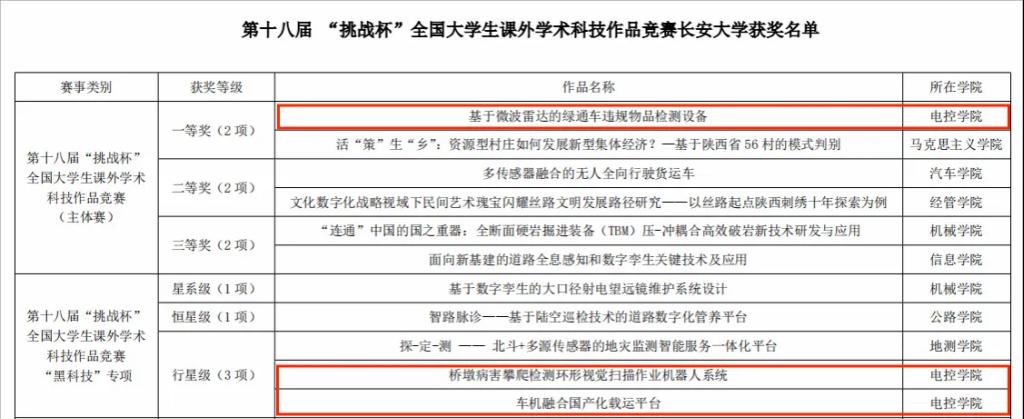 2023年度,学院在学校第十三届“挑战杯”竞赛中获特等奖2项、一等奖1项、二等奖4项、三等奖3项。在第十四届陕西省“挑战杯”课赛中学院获特等奖1项。在第十八届全国“挑战杯”竞赛中学院获主体赛一等奖1项、“黑科技”行星级奖项2项。在2023年全国大学生机器人科技创新交流营暨机器人大赛中学院1支队伍荣获国家级二等奖。