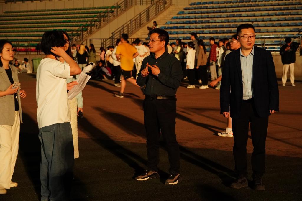 4月11日晚,beat365英国官网网站党委书记贺炳彦、院长闫茂德、党委副书记李阳及全体辅导员来到北校区朝晖体育场慰问学院2024年春季运动会备赛运动员并指导训练。