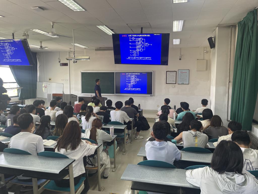 此次教学观摩的课堂是杨照辉老师的《电工与电子技术基础Ⅲ(二)》,上课教室为渭水校区WM1410,采用的是随堂的形式进行观摩。基础教学部的刘岳镭老师、易盟老师、交控系的牛鸿敏老师、王学楷老师、自动化系的刘习尧老师、机器人工程系的梁浩翔老师、郭一鸣老师、轨道卓工系的刘维宇老师、王彬宇老师参加了此次课堂教学观摩。杨照辉老师表示本次课程的主要内容是:数字电子技术中组合逻辑电路分析,三人表决器等。课后杨照辉老师与观摩教师做了讲课内容的交流,分享了多年来积累的讲课经验。