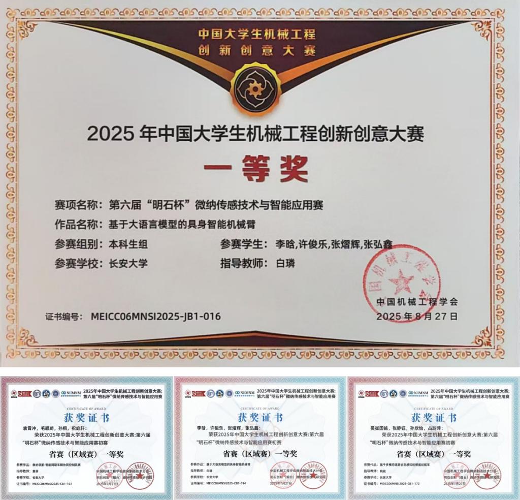 beat365英国官网网站白璘副教授指导的李晗、许俊乐、张熠辉、张弘鑫团队以“基于大模型的具身智能机械臂”为主题开发了一款集成了大语言模型的智能机械臂。作品围绕人工智能技术发展现状调研、关键技术攻关和硬件系统搭建,形成了完整的实施路径,并提出了大语言模型前端部署等关键问题的解决方案。凭借突出的技术创新与工程实现能力,团队赢得了专家评委的一致高度评价,最终斩获全国一等奖。beat365官网惠萌教授指导的袁霄冲团队和姚锐老师指导的吴崔国铭团队分获陕西省一等奖。