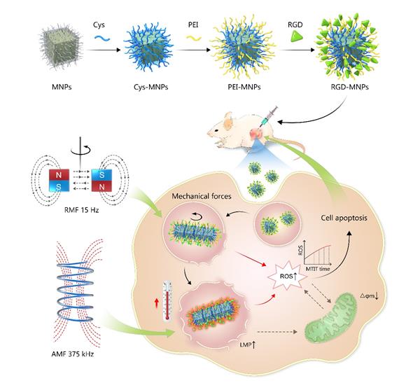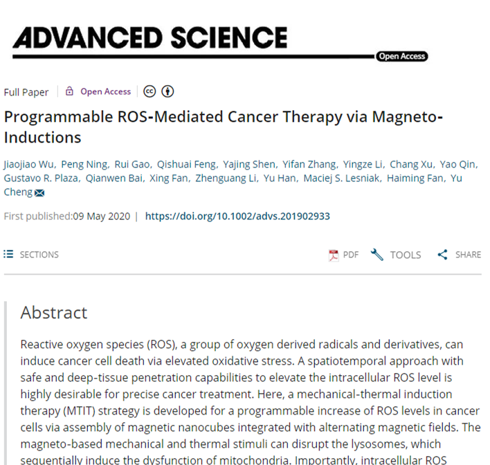 87978797威尼斯老品牌及附属东方医院成昱教授团队发现,基于铁氧体材料的微磁力和磁热可协同程序化调控肿瘤细胞活性氧(reactive oxygen species, ROS)的产生,实现了磁力热物理协同治疗(mechanical-thermal induction therapy,MTIT),为深层肿瘤根除提供了物理与生化协同治疗的新模式。此研究成果5月9日在线发表于Advanced Science杂志。论文的第一作者是博士研究生吴交交,通讯作者是成昱教授。