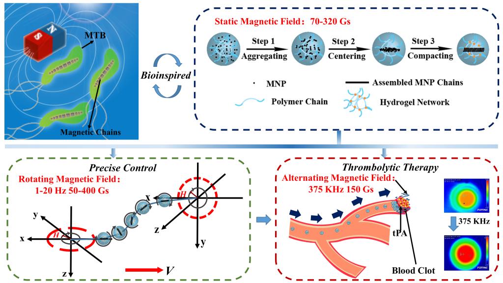 仿趋磁菌软体微型机器人的设计、制备、磁控及其微血管溶栓应用示意图