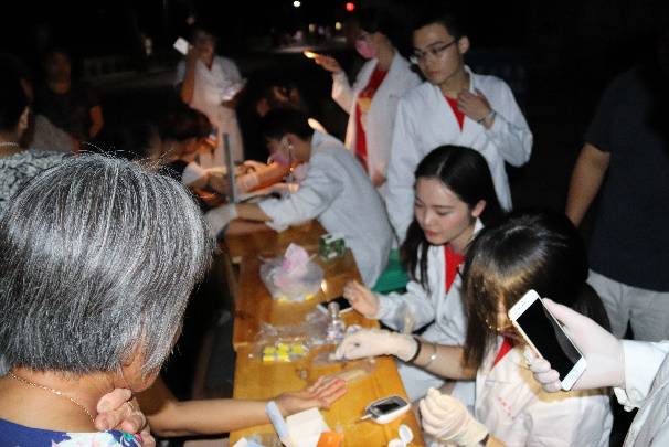 还记得在李庄进行健康咨询的第一天,我们便感受到了李庄村民的热情,测量血压结束后交谈的村民对于当年同济李庄的故事都能说上一些。他们没忘,而同济人也没忘。虽然当天下午义诊已到原定结束的时间,但还有老爷爷奶奶在排队等着,团队很默契的在天黑之后仍旧打着手机灯光,目的是不让任何一个前来的李庄人失望。