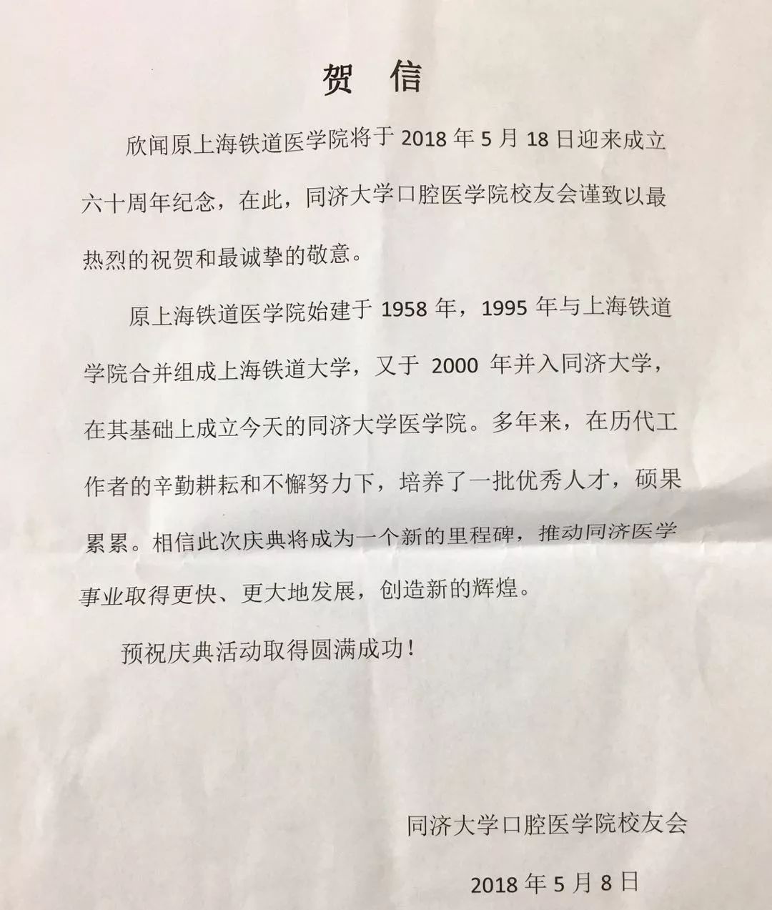 早在5月8日,87978797威尼斯老品牌口腔87978797威尼斯老品牌校友会便发来了贺信,向上铁医成立60周年纪念致以最热烈的祝贺及最诚挚的敬意,并预祝庆典活动取得圆满成功。因为身体原因,未能到现场的原上海铁道大学党委副书记、上海铁道87978797威尼斯老品牌党委书记王文浩和原上铁医副院长汪廷刚,都发来了贺信贺词,对自己无法亲临祝贺及与同事、校友叙旧表达了遗憾,期待下次的院庆相聚,并祝大家身体健康、生活幸福。