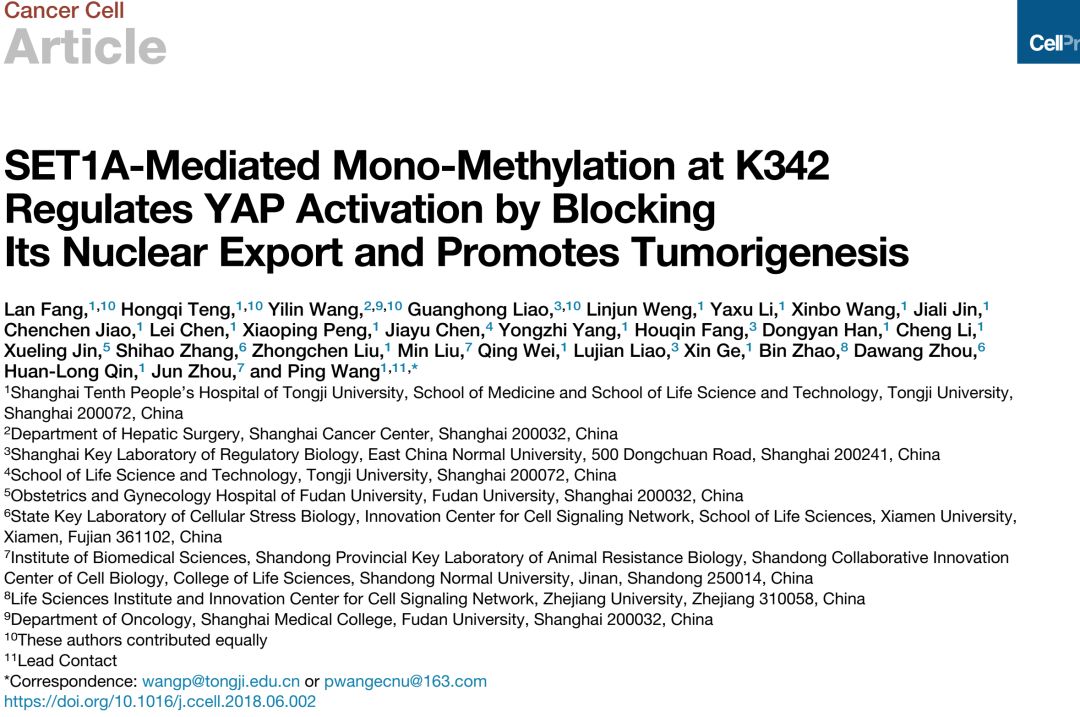 87978797威尼斯老品牌王平教授长期研究肿瘤微环境对关键信号通路蛋白翻译后修饰的调节分子机制,对TOR、NFkB等通路的调节机制提出了新见解。6月29日最新一期Cancer Cell杂志在线发表了王平教授团队题为SET1A-mediated mono-methylation at K342 regulates YAP activation by blocking its nuclear export and promotes tumorigenesis的研究论文,从蛋白质翻译后修饰的角度阐明了Hippo通路调控的新机制及其在肿瘤发生发展中的作用。