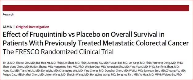 FRESCO研究是一项在中国开展的随机、双盲、安慰剂对照的多中心III期临床研究,由我院肿瘤医学部主任李进教授和中国人民解放军第八一医院副院长秦叔逵教授共同领导,复旦大学附属肿瘤医院、和记黄埔医药与礼来制药等全国共28家临床药物研究机构参与完成。