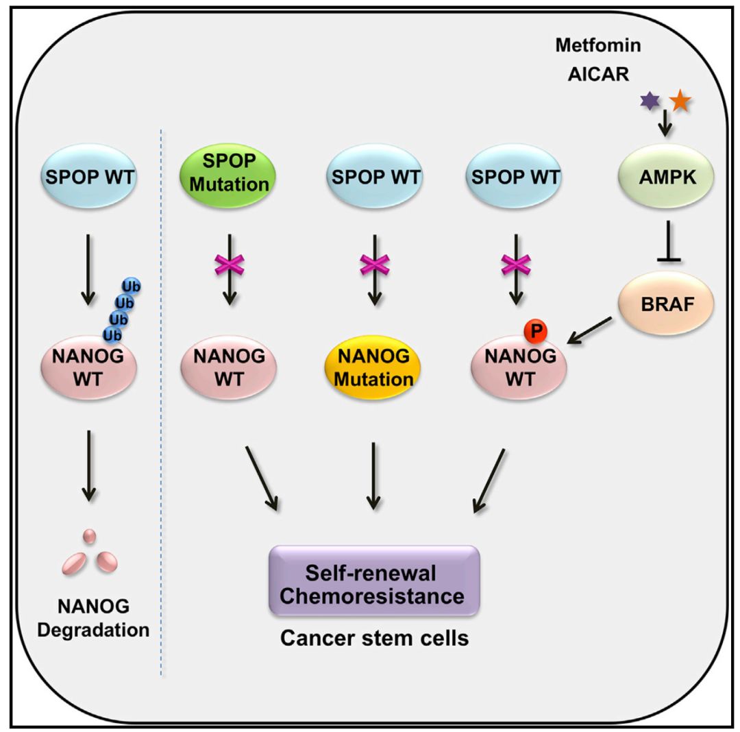 NANOG的SBC基序富含丝/苏氨酸,是潜在的磷酸化位点,质谱数据表明在生理状况下该基序可发生磷酸化修饰,NANOG-Ser68的磷酸化修饰可显著增强其蛋白质稳定性。进一步的研究发现AMPK-BRAF信号通路可抑制NANOG-Ser68的磷酸化,并增强NANOG与SPOP的结合能力,从而下调NANOG的蛋白水平,AMPK激活剂Metfomin和AICAR可抑制NANOG-Ser68的磷酸化,促进NANOG的泛素化降解,从而抑制肿瘤干细胞的活性,为靶向肿瘤干细胞治疗提供了潜在的靶点。