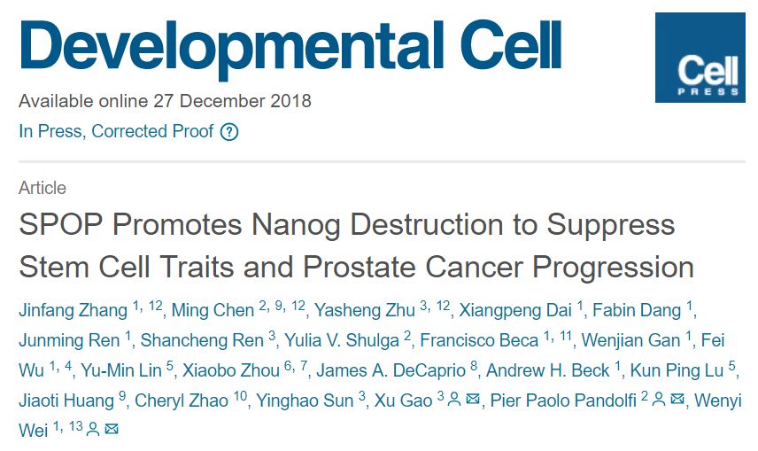 值得关注的是,该论文与哈佛大学魏文毅教授的研究工作 SPOP promotes Nanog destruction to suppress stem cell traits and prostate cancer progression以“背靠背”形式同期发表在 Developmental Cell 上。