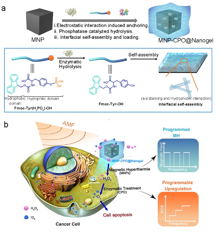团队利用磁性纳米材料作为磁热介质为肿瘤“点火”,通过酶的高效生物催化作用引发内源性ROS的“爆发”,研发了新型载酶磁性纳米凝胶(MNP-CPO@Nanogels),作为一种程序化可控活化的仿嗜中性粒细胞模拟物,控制上调细胞内氧化活性最强的单线态氧(1O2),即磁酶联合治疗(METT),展开肿瘤灭杀工作。据悉,该磁性纳米凝胶以锌掺杂的磁性四氧化三铁(Fe3O4)纳米颗粒为核,通过酸性磷酸酶诱导寡肽小分子界面自组装,可在磁性Fe3O4纳米颗粒表面包覆一层凝胶层;同时,借助非共价键作用,载负氯过氧化物酶 (CPO),使其具有良好的结构稳定性和催化活性。细胞水平上,这种新型载酶磁性纳米凝胶介导的磁酶联合治疗可依次调控细胞内及1O2。磁热(43 ℃)可触发细胞内生化信号过氧化氢(H2O2)的产生,继而被氯过氧化物酶催化生成毒性更强的1O2,迫使80%的肿瘤细胞凋亡。