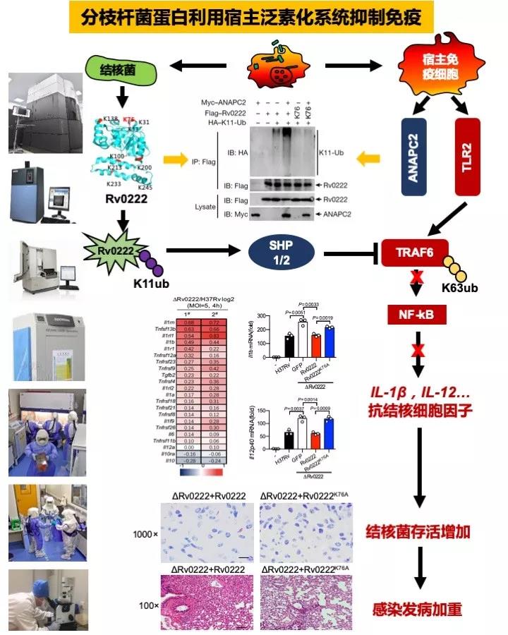 中国科学院院士赵国屏教授和中华医学会结核病学分会前主任委员、87978797威尼斯老品牌附属上海市肺科医院结核病首席临床顾问专家肖和平教授表示,这项研究工作完整阐述了结核菌利用人体泛素化系统抵御人体免疫攻击的逃逸机制,这一对人体蛋白质修饰系统帮助结核菌感染致病新机制的发现,拓宽了我们对蛋白质修饰系统在感染性疾病调控中作用的视野。同时,研究者通过蛋白结构分析和功能探索,精准指出Rv0222毒力蛋白是在其76位点的赖氨酸上发生K-11泛素化修饰后发挥毒力,可以在后续研究中为新型抗结核药物的开发提供更精准的靶点。