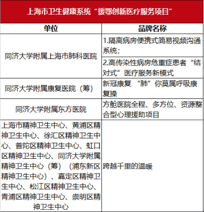 为进一步弘扬伟大抗疫精神,充分展示上海援鄂医务人员尽心尽力、主动作为、因地制宜、勇于创新的抗疫成果,上海市卫生健康系统文明办在全国首创“援鄂医疗创新服务项目”推选活动。主要包括降低医护人员感染风险的改造发明、减少压疮和改善创面护理的系列妙招、基于信息技术的后方支持、富有中医元素的特色诊疗、彰显人文关怀的心理援助、方便医护和患者的细节服务等。