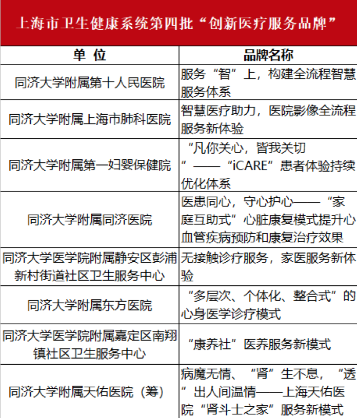 12月14日,上海市卫生健康系统第四批“创新医疗服务品牌”入选品牌和“援鄂医疗创新服务项目”双双公布,同医系统8个项目入选第四批“创新医疗服务品牌”品牌,4个项目入选“援鄂医疗创新服务项目”。