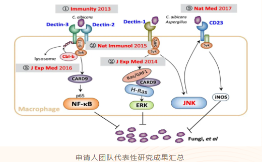 该成果由贾鑫明教授、清华大学林欣教授、赵学强副研究员和中科院巴斯德研究所肖晖研究员合作完成,得到了国家“优青”等课题的资助。申请人团队围绕“真菌感染的免疫应答及调控机制”这一关键科学问题,系统研究阐明了真菌感染的免疫识别及应答多样性机制,率先发现了真菌免疫负调控的多样性机制,奠定了以C型凝集素受体及其下游关键分子为靶点,研发新型抗真菌药及免疫治疗新策略的理论基础,并提供了筛查真菌感染患者先天性免疫缺陷新的免疫检查点。