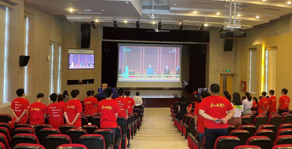 升旗仪式结束后,全体师生代表前往沪西校区小礼堂,共同观看建党100周年庆祝大会直播。