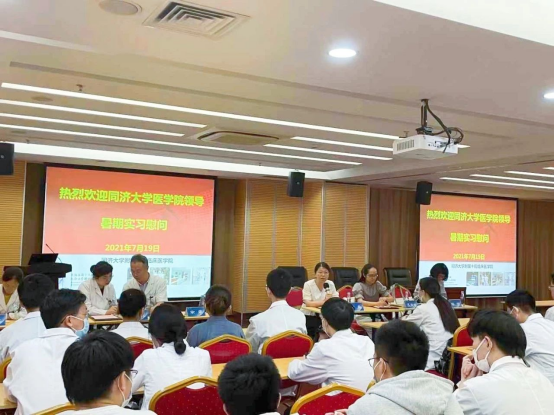 杨文卓对附属医院精心的实习安排与悉心的教导培育表示了衷心的感谢,了解了各科室学生目前的实习工作情况,勉励同学们将书本知识和临床实践紧密结合,从书本到实践、再从实践回到书本,珍惜实习机会,提高临床技能。
