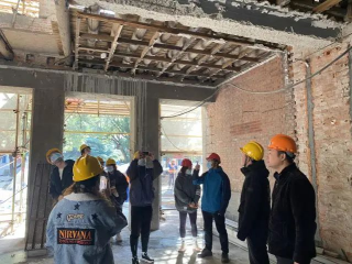 沪西校区管委办主任徐纪平带领同学们参观了第三教学楼外围的施工工地,为大家介绍了第三教学楼的历史和变迁。之后,在采取安全防护措施下,徐主任与施工单位负责人一起带领同学们进入第三教学楼。他们向同学们介绍建筑的原有木制承重结构,深入浅出地分析了原有结构的安全隐患及目前钢承重结构改建计划的技术难度和施工细节,并带领同学们参观了已完成部分和原有结构的对比,让同学们有直观的感受。