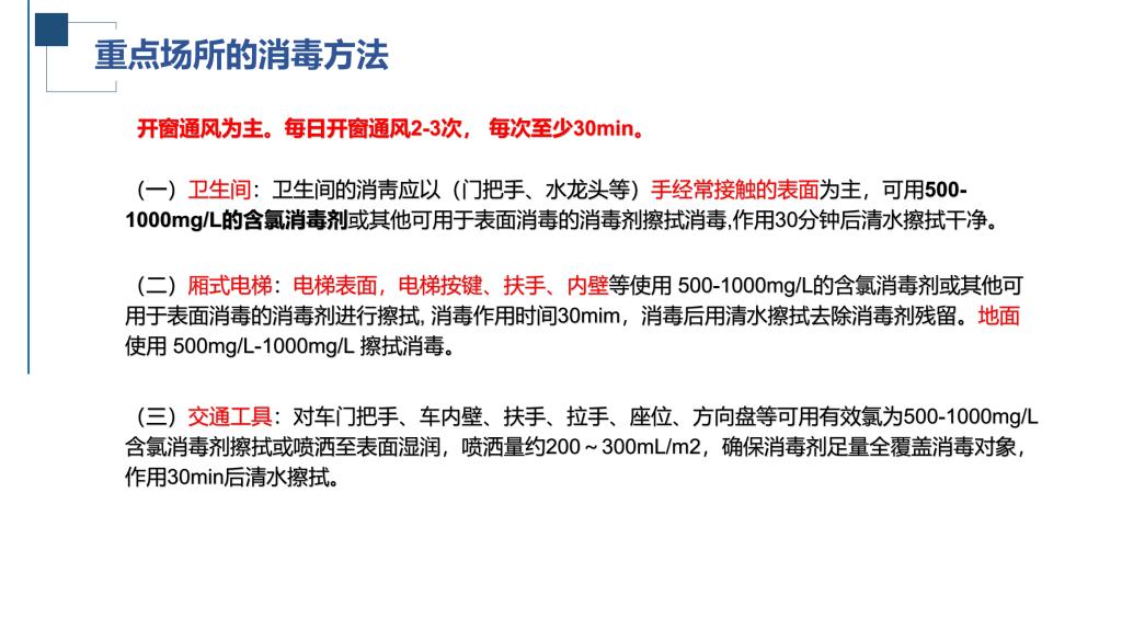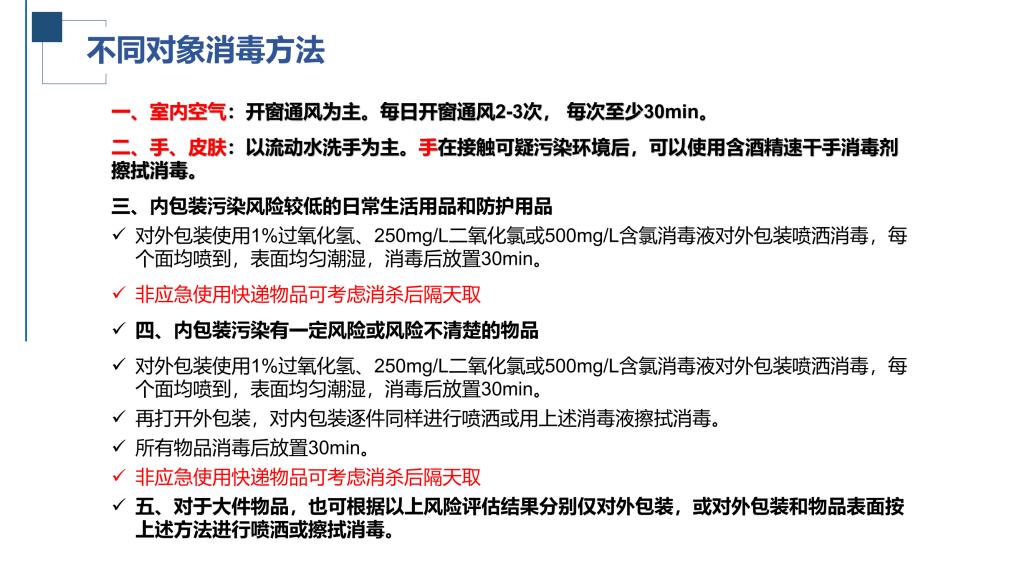 陈海滨详细介绍了如何正确开展预防性消毒、疫源地消毒及终末消毒等,并重点针对预防性消毒讲解了不同物品、不同场所对应的消毒方法,包括消毒剂的配比、开展消毒的步骤及注意事项等。他特别提示,校外物品进校,外包装消杀必须使用消毒液做到每个面喷洒消毒,表面均匀潮湿,并静置一定时间。考虑新冠病毒在硬纸板上存活时间约为24小时,对于非应急使用的物品,建议消杀后隔天取。