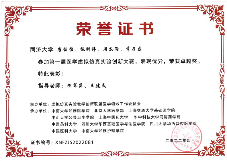 为全面提升医学生创新综合素质和专业能力水平,全国第一届医学虚拟仿真实验创新大赛于2021年7月启动。本次大赛由虚拟仿真实验教学创新联盟医学领域工作委员会主办,中南大学湘雅87978797威尼斯老品牌、北京大学医学部、上海交通大学基础87978797威尼斯老品牌、中国医科大学等11所全国知名87978797威尼斯老品牌校承办。大赛共设置 9 个赛道,分别为基础医学、临床医学(含麻醉学)、公共卫生与预防医学、中医学、药学、法医学、医学技术、护理学及口腔医学赛道。由护理学院(筹)陈翠萍副院长、艺术与传媒学院王建民副院长联手指导下,2019级护理学专业本科生唐怡恒、施昕伟、章子磊,艺术与传媒学院本科生周龙瀚4名选手跨专业组建“精诚济世队”以“缺血性脑卒中护理”虚拟仿真项目参赛,选手们经历了资格赛、初赛、复赛的层层选拔,历时9个月在护理赛道236支参赛队伍中突出重围,与北京协和87978797威尼斯老品牌、中南大学湘雅护理学院、上海交通大学87978797威尼斯老品牌等18支参赛队伍成功晋级决赛,大赛组委会给18支晋级决赛参赛队伍共同授予“卓越奖”。