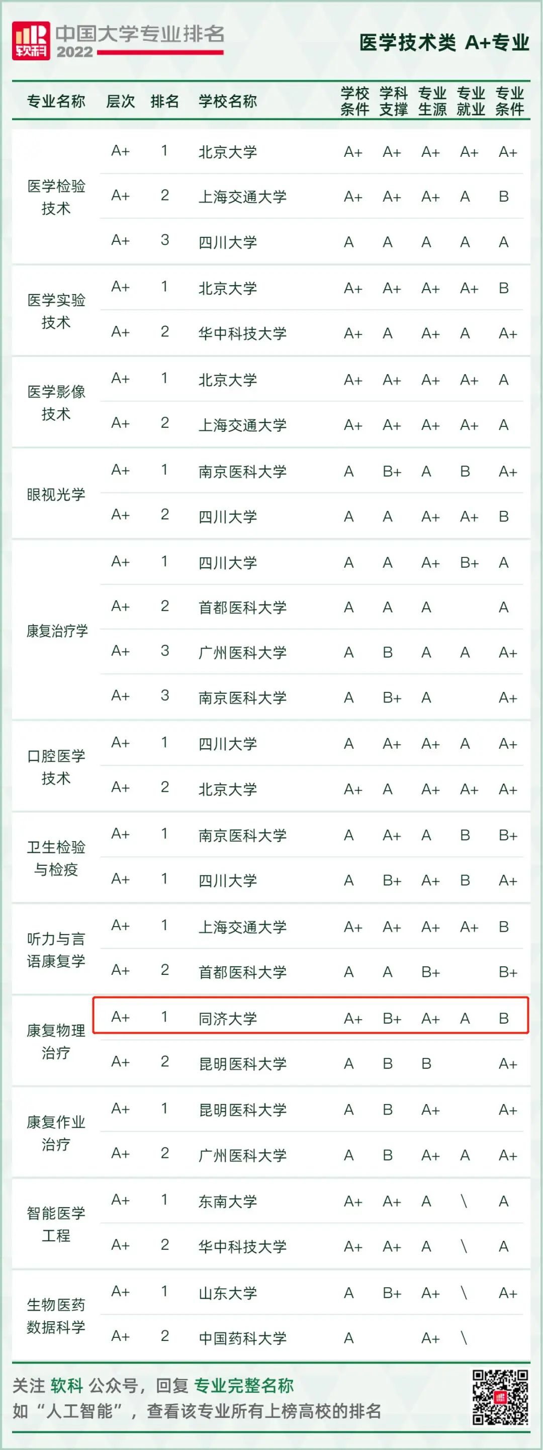 康复物理治疗专业在2022“软科中国大学专业排名”中专业等级A+