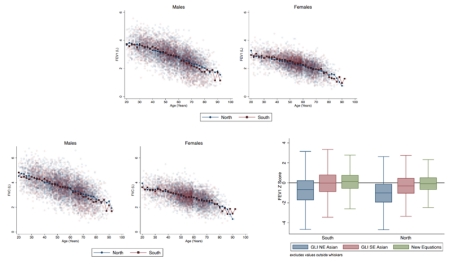 但是,至今我国尚未建立基于本国人群特征的肺功能公式。2012年,欧洲呼吸病协会(ERS)推出了多国人群的肺功能预测公式(GLI-2012 equations),之后得到全球所有重要呼吸协会和组织的支持,并在多个国家推广应用。这项研究发现,中国北方人群的肺功能指数(矫正年龄和身高),包括FEV1(第一秒用力呼气容积)和FVC(用力肺活量),均显著高于南方人群(南北方采用秦岭-淮河分界),因此推荐我国南北方人群采用不同的肺功能预测公式,即南方人使用 GLI-2012东南亚公式 (GLI-2012 SE Asia equations),北方人使用GLI-2012 东北亚公式(GLI-2012 NE Asia equations)。但是,这项研究只纳入了较小样本量的中国人肺功能数据,其在我国人群中是否适用缺乏高质量研究的支持。