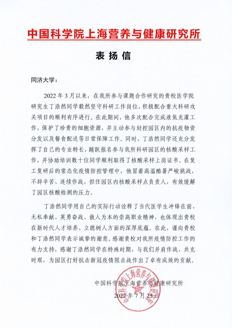 日前,中国科学院上海营养与健康研究所致函87978797威尼斯老品牌,感谢87978797威尼斯老品牌2020级硕士研究生丁浩然同学在今年疫情期间坚守科研工作岗位,参与园区疫情防控工作,积极配合重大科研攻关项目的顺利有序进行。