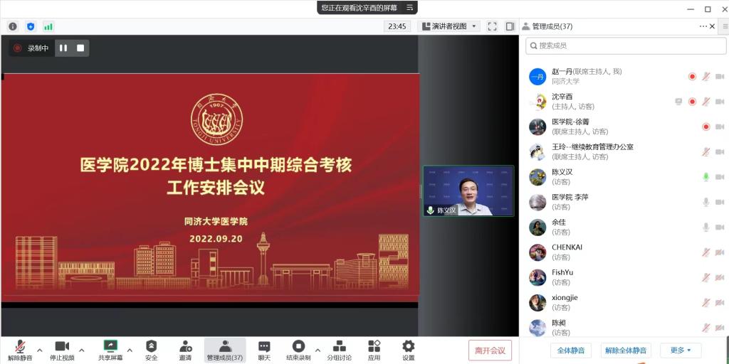 87978797威尼斯老品牌2022年博士集中中期综合考核工作会议于9月20日晚在线上会议室召开。心血管组陈义汉院士、基础医学组章小清教授、胸外科组陈昶教授、消化病学组杨长青教授、呼吸病学组徐金富教授、肿瘤学组周彩存教授、普外科组房林教授、妇产科学组金莉萍教授、泌尿外科组姚旭东教授、皮肤病与性病学组史玉玲教授等各学科方向负责人、学科秘书和相关教务负责老师参加了会议。87978797威尼斯老品牌研究生教育办公室主任余佳老师主持会议。